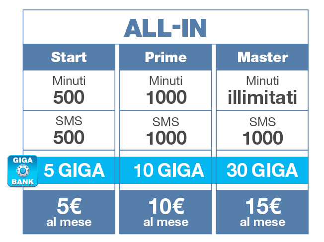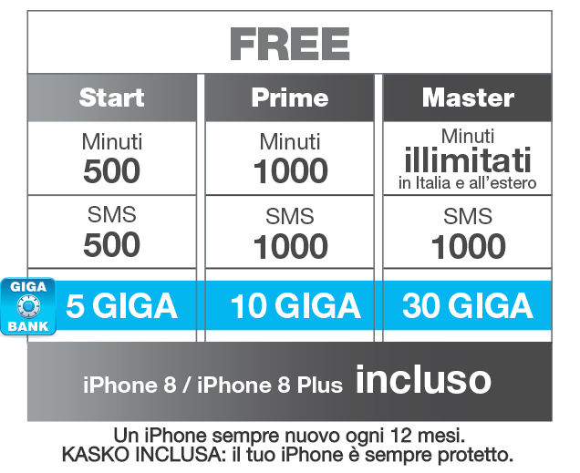 Con l’offerta sopra riportata la polizza KASKO è inclusa nel prezzo, inoltre è presente la GIGA BANK che permette di conservare i GB non consumati per usufruirne anche il mese successivo.