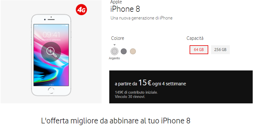 Viene messa in primo piano la promozione Vodafone RED che prevede un costo mensile di 35€ ogni 4 settimane (25€ se si effettua pagamento con carta di credito) in cui sono inclusi 8GB di internet, minuli illimitati ed SMS illimitati. Al costo dell’offerta vanno aggiunti 15€ di rata mensile del dispositivo in versione da 64GB, per un totale complessivo di 40€ al mese più un contributo iniziale di 149€. Questa riteniamo essere la migliore offerta disponibile per l’operatore rosso ed il piccolo iPhone 8.