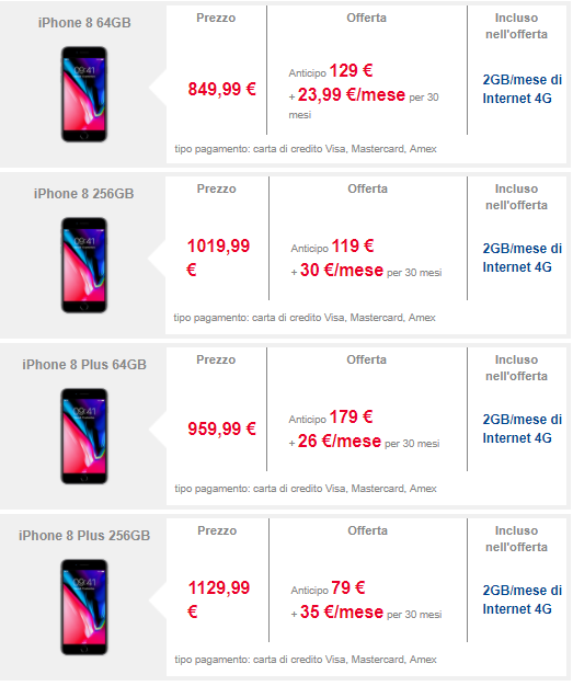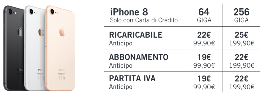 I prezzi per questa promozione partono da 25€ al mese per iPhone 8 e da 30€ al mese per iPhone 8 Plus. Ovviamente anche l’anticipo varia a seconda dell’offerta e del taglio di memoria scelto.