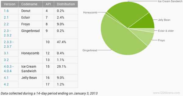 Nel frattempo le quote dell’ormai superato Ice Cream Sandwich sono aumentate dal 27,5% al 29,1%, laddove l’antenato Gingerbread è sceso dal 50,8% al 47,6%, che risulta ancora il più utilizzato.