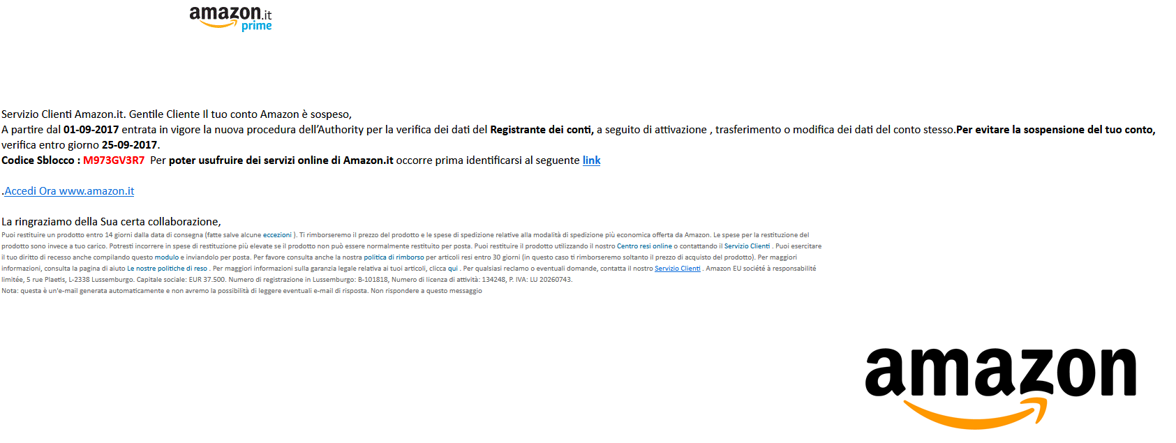 “Servizio Clienti Amazon.it. Gentile Cliente Il tuo conto Amazon è sospeso,