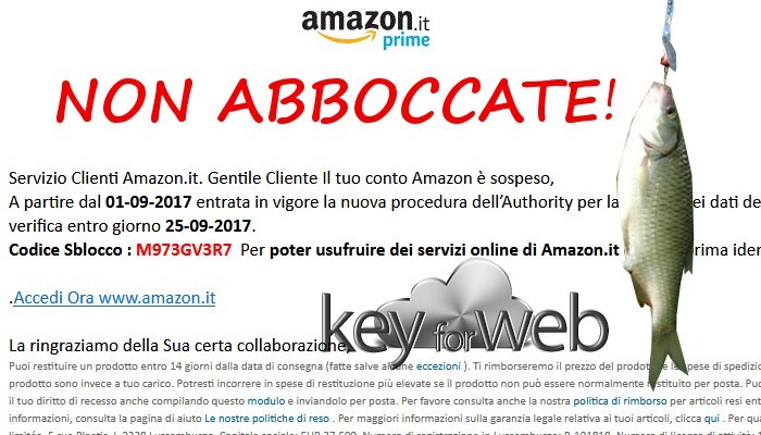Ritorniamo a mettervi in allerta sulla questione truffe online, quelle mirate a rubare la vostra identità e/o i vostri dati con la speranza per i malviventi di riuscire ad anticipare il Natale. Questa volta viene sfruttata l’identità di Amazon Italia che, inconsapevolmente, viene utilizzata come amo sperando per l’appunto che i pesci abbocchino.