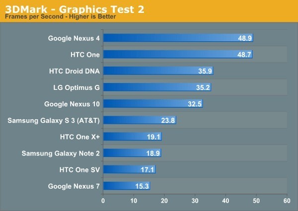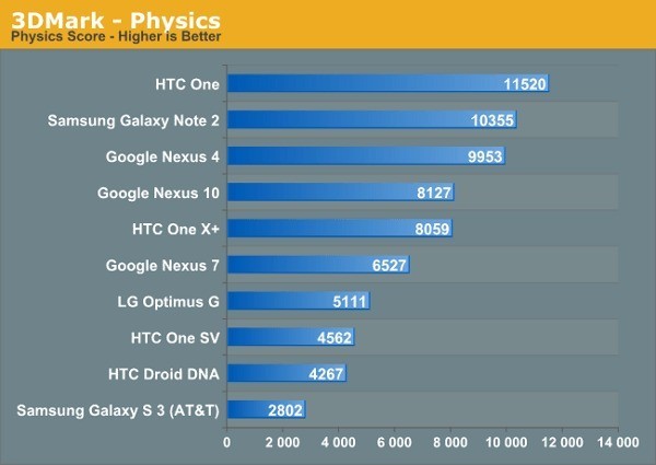 In rete già cominciano a fioccare vari screenshot in cui vengono riportati i vari risultati ottenuti, in cui al momento emergono sia l’HTC One (nel test physics che stressa CPU e GPU) che il Nexus 4 (nel test graphics nel quale un enorme quantità di pixel viene spostata contemporaneamente).