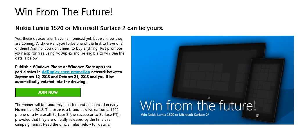 Per partecipare al concorso basta pubblicare uno smartphone Windows Phone o un’app tramite AdDuplex, e si può vincere un Surface2 o Lumia 1520.