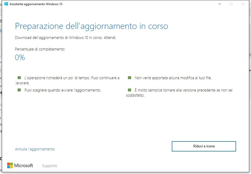 - Verrà avviato il download di Windows 10 Creators Update al termine del quale verrà effettuato una verifica del corretto scaricamento dei file di installazione