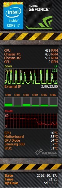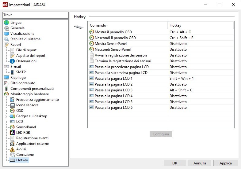 Una nuova funzionalità adesso permette agli utenti di gestire delle hotkey (scorciatoie da tastiera) che consentono di abilitare o disabilitare i pannelli di monitoraggio hardware di AIDA64 o di passare attraverso diverse schermate informative sui pannelli LCD esterni, anche quando AIDA64 è funzionante in background. Utilizzando queste hotkey personalizzate, gli utenti PC più smaliziati possono anche avviare e fermare la registrazione dei valori relativi alle temperature, alle tensioni di funzionamento, ai consumi così come alla velocità di funzionamento delle ventole in file di registro CSV o HTML.