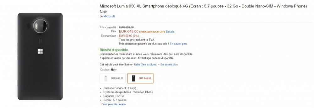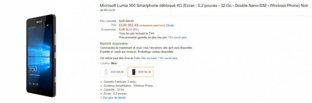 Così come in Italia infatti, Amazon Francia ha dato via da tempo al preordine dei nuovi Lumia 950 e Lumia 950 XL con prezzi rispettivamente di 599€ e 699€, rivedendo però successivamente questi prezzi, apportando un taglio di 37 euro per Lumia 950 e di ben 50 euro per il Lumia 950 XL.