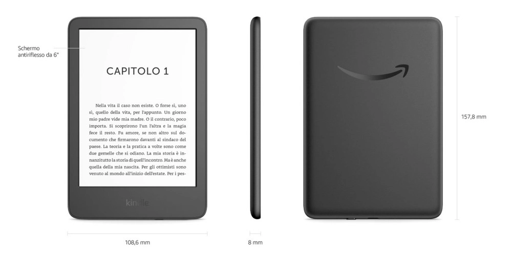 Questa nuovo Kindle monta un display da 6 pollici con trattamento antiriflesso e risoluzione aumentata, che arriva a 300 ppi. E’ presente la modalità scura e la luce frontale regolabile, che consentono una lettura confortevole sia che ci si trovi nel buio totale sia sotto la luce diretta del sole.