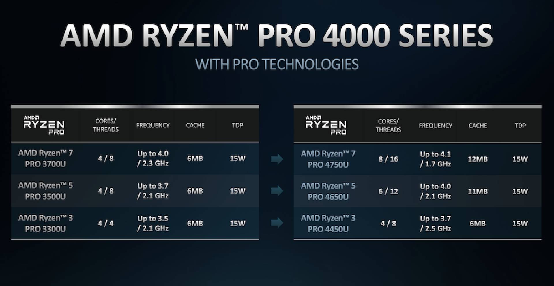 AMD per ora ha confermato tre modelli: Ryzen 7 Pro 4750U, Ryzen 5 Pro 4650U e Ryzen 3 Pro 4450U. Ognuno di questi modelli integra una grafica integrata Radeon e TDP di 15W.