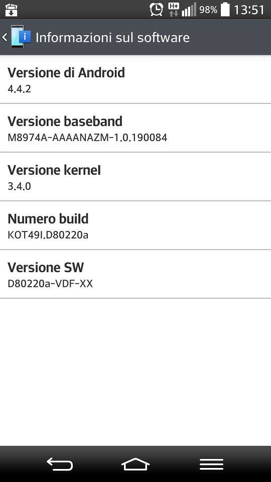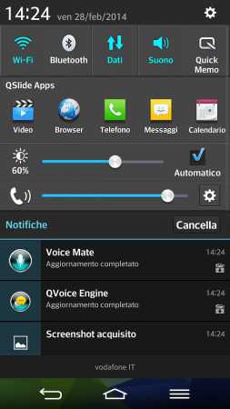 Avevamo parlato del rilascio dell’aggiornamento ad Android 4.4.2 per l’LG G2, che era iniziato in Korea poco tempo fa e di quanto era stato il cambiamento in fatto di performance, rispetto alla versione con precedente con Jelly Bean. Bene oggi arriva il tanto atteso aggiornamento a cominciare dal brand Vodafone, e anche se non si dispone di un changelog completo dei cambiamenti che apporterà possiamo anticiparvi che, oltre alle classiche modifiche apportate da KitKAt, possimo dirvi che, a differenza della versione coreana, in questa è assente il compilatore ART, introdotto da Google per migliorare le prestazioni del sistema operativo. Dalle immagini possiamo notare anche la diversa collocazione del menu impostazioni quando si tira giù la barra delle notifiche.