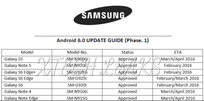 Il documento appena trapelato vedrebbe Android 6.0.1 Marshmallow per Galaxy S6 Edge+ e Galaxy Note 5 pronto per il rilascio già dal prossimo mese di febbraio, mentre tra febbraio e marzo l’aggiornamento potrebbe arrivare su Galaxy S6 e Galaxy S6 Edge. A seguire, tra marzo ed aprile, Android 6.0.1 Marshmallow dovrebbe essere rilasciato ufficialmente per Galaxy S5, Galaxy Note 4 e Galaxy Note Edge.