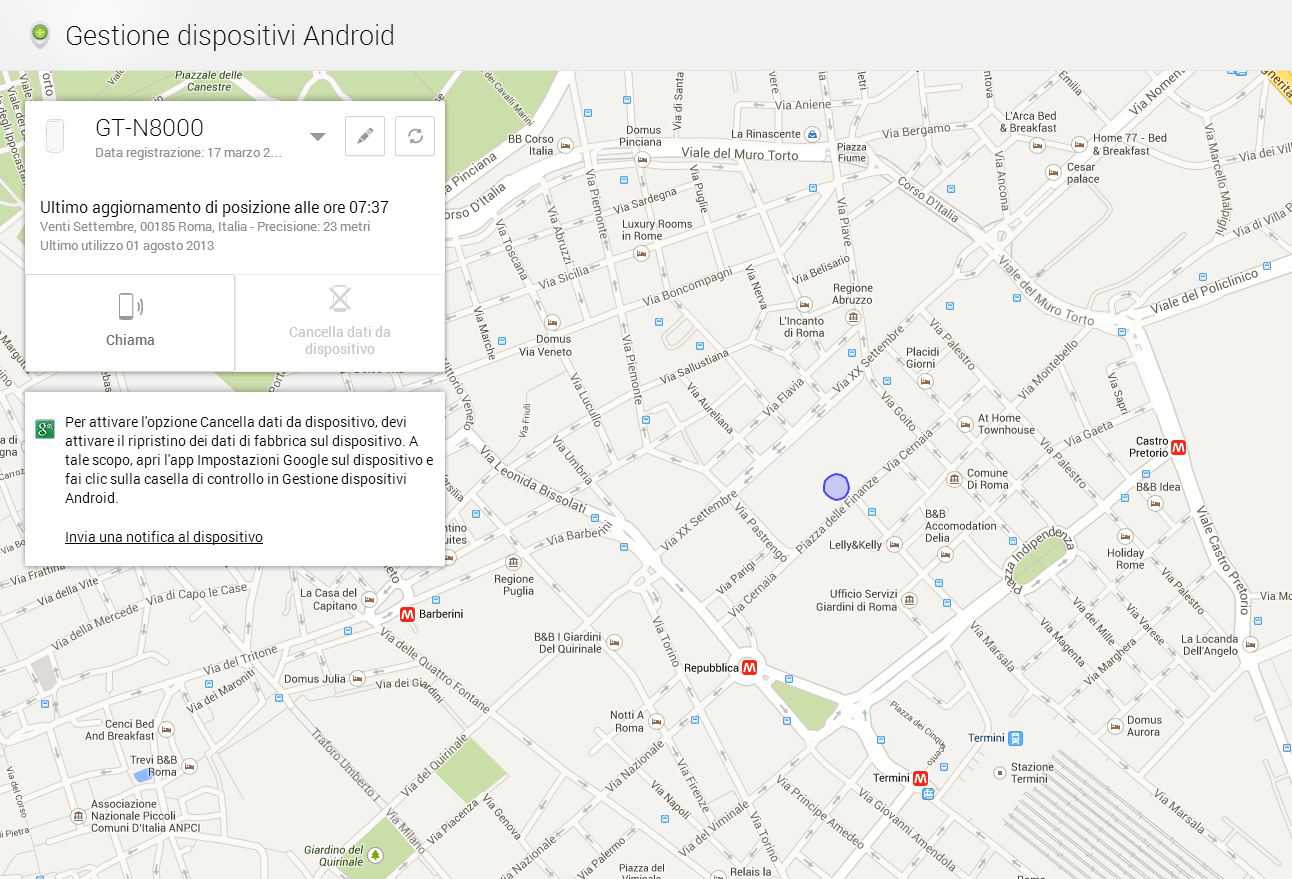Verranno mostrati tutti i dispositivi Android legati all’account Google attivo e sarà possibile visualizzarne la posizione attraverso Google Maps ed inoltre sarà possibile inviare degli squilli da remoto che potrebbero aiutare a localizzare il device. Inoltre impostando il ripristino dei dati di fabbrica aprendo l’applicazione “Impostazioni Google” sul dispositivo e selezionando la casella di controllo in Gestione dispositivi Android, nella peggiore delle ipotesi sarà possibile cancellare, sempre da remoto, tutti i dati presenti sul dispositivo così da non lasciarli in mano a sconosciuti.