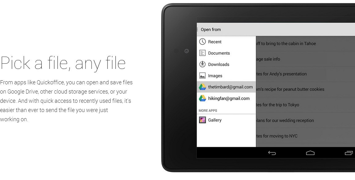 Le applicazioni come QuickOffice, interamente riprogettata, si integrano sempre di più con Google Drive (o altri servizi Cloud), dove è possibile salvare i vostri file senza occupare la memoria del dispositivo; con un rapido accesso ai file utilizzati di recente è più facile che mai gestire i documenti ed inviarli via mail.