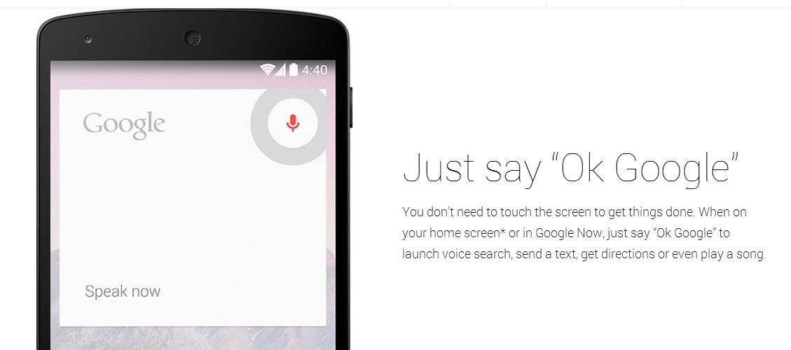 Sulla base di quanto già fatto con il Moto X con la funzione “Always listening”, Google Now migliora decisamente guadagnando maggiore reattività. Basterà dire semplicemente “OK Google” per poter effettuare immediatamente ricerche, dettare un testo o avviare la navigazione verso un luogo. Google Now è ora accessibile in due modi: il primo è quello classico di swipe verso l’alto dalla navigation bar, il secondo è tramite uno swipe verso sinistra partendo dall’ultima homescreen a sinistra. Attualmente non si sa se la funzione sia estesa anche ad altre lingue oltre a quella Inglese.