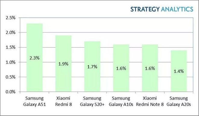 Più nello specifico, i dati evidenziati dall’analisi mostrano una grande crescita del mercato degli smartphone di fascia media, con Samsung Galaxy A51 in testa con 2,3% delle vendite totali, seguito da Xiaomi Redmi 8 con l’1.9% e Samsung Galaxy S20+ con 1.7%.