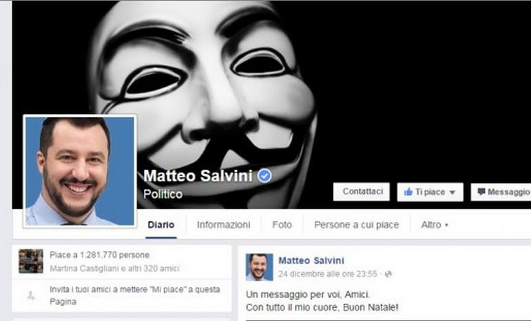 Anonymous attacca, Matteo Salvini risponde, il tutto a colpi di social network: la divisione italiana del famoso gruppo hacker Anonymous aveva anticipato l’attacco deciso nei confronti di Matteo Salvini, arrivato puntuale sulla pagina ufficiale di Facebook del leader della Lega Nord, dove è apparsa improvvisa la classica maschera utilizzata dai militanti del gruppo hacker e legata al famoso film “V per Vendetta”, seguita dall’altrettanto celebre frase: “We are Anonymous We are legion We do not forgive We do not forget Expect us“.