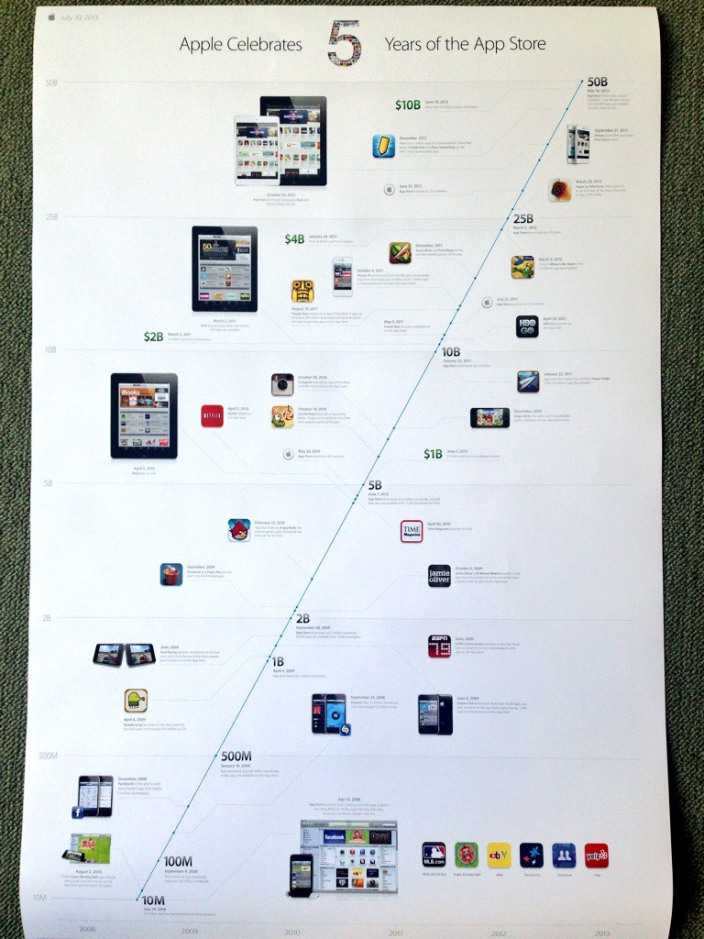 Nella celebrazione dei 5 anni della nascita dell’Apple Store, la casa di Cupertino ha voluto festeggiare l’evento inviando a Tim Bradshaw, giornalista del Financial Times, il poster (che vedete in basso) che mostra una sequenza temporale di tutti gli importanti eventi dell’immenso catalogo di applicazioni mobile. La time line ci fa vedere come il numero delle applicazioni sia arrivato all’incredibile cifra di 900.000 unità con oltre 50 miliardi di download.