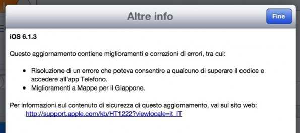 Va segnalato inoltre che una volta aggiornato il device Apple alla nuova versione 6.1.3 non sarà possibile effettuare il downgrade per cui, se siete tra gli utenti con device jailbreak vi consigliamo di non aggiornare per il momento!