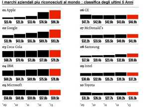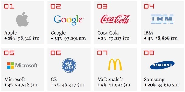 La casa produttrice dell’iPhone ha scansato Coca-Cola che era al top della lista dal 2000, con un marchio che Interbrand ha valutato a 98,3 miliardi di dollari. E data la grande importanza dei marchi tecnologici in questa nuova economia globale, Google e’ risultata essere seconda nella lista, con un marchio valutato a 93,3 miliardi di dollari, molto piu’ del marchio Coca-Cola che invece ha ottenuto una valutazione di 79,2 miliardi di dollari.
