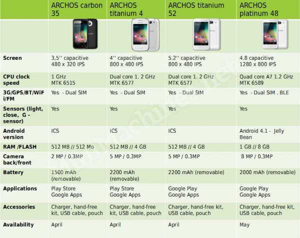 Tutti i nuovi telefoni Archos avranno il supporto per la seconda SIM e monteranno sia Android ICS (per i primi tre) che Jelly Bean 4.1 (per il Platinum 48) . L’ Archos Platinum 48 arriverà presumibilmente a Maggio mentre gli altri tre dovrebbero essere disponibili anche a fine di questo mese.