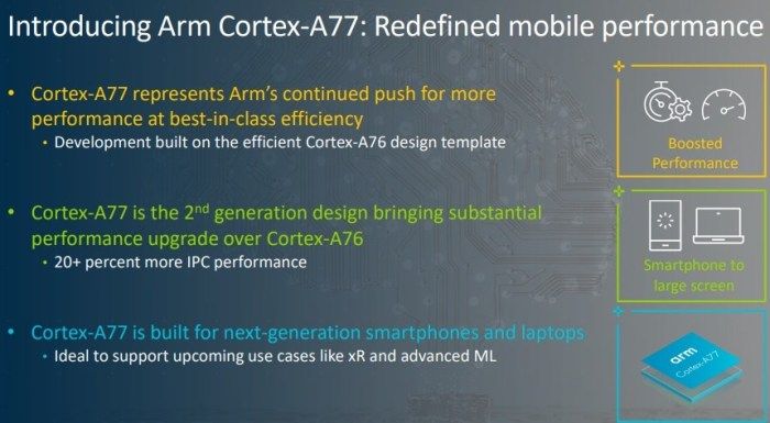 Arm Cortex-A77, è caratterizzato da un architettura a  7 nanometri. Rispetto alla precedente versione Cortex-A76, questo incrementa le performance delle IPC del 20%. Parliamo di una CPU che ovviamente lavora soprattutto nell’ambito del machine learning, e come tale punta a d incrementare le performance degli algoritmi. La CPU inoltre dovrebbe migliorare anche sul fronte del consumo energetico.