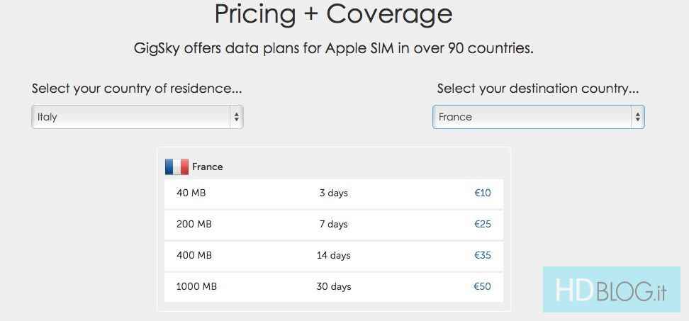 I prezzi, poi, cambiano da paese a paese; ad esempio utilizzando la SIM italiana in paesi come Germania, Spagna e Regno Unito, per avere il massimo dell’offerta dovremo sborsare 50€ per 3GB con soglie a partire da 75MB per 10€ di costo.