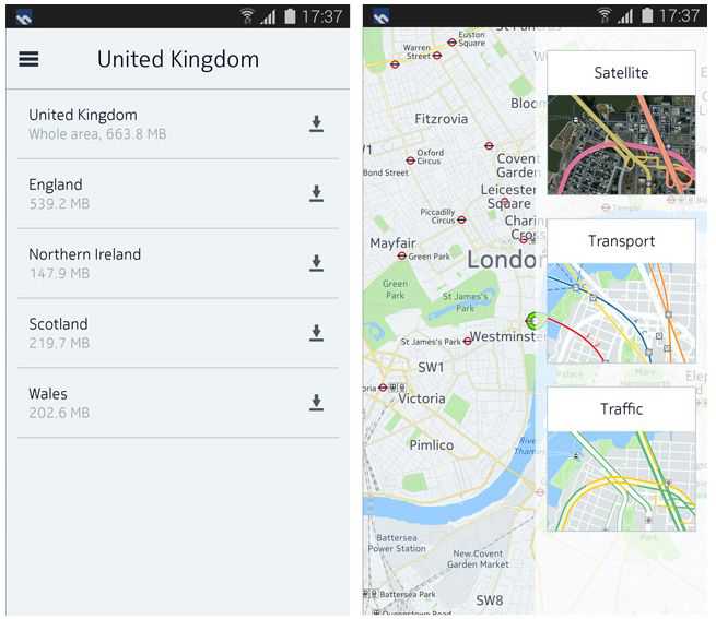 Per utilizzare Nokia HERE su Android, sarà sufficiente selezionare una mappe relativa all’area da percorrere che sarà salvata sulla memoria interna del dispositivo Android, favorendo così la navigazione anche dove la connessione dati non sarà disponibile.