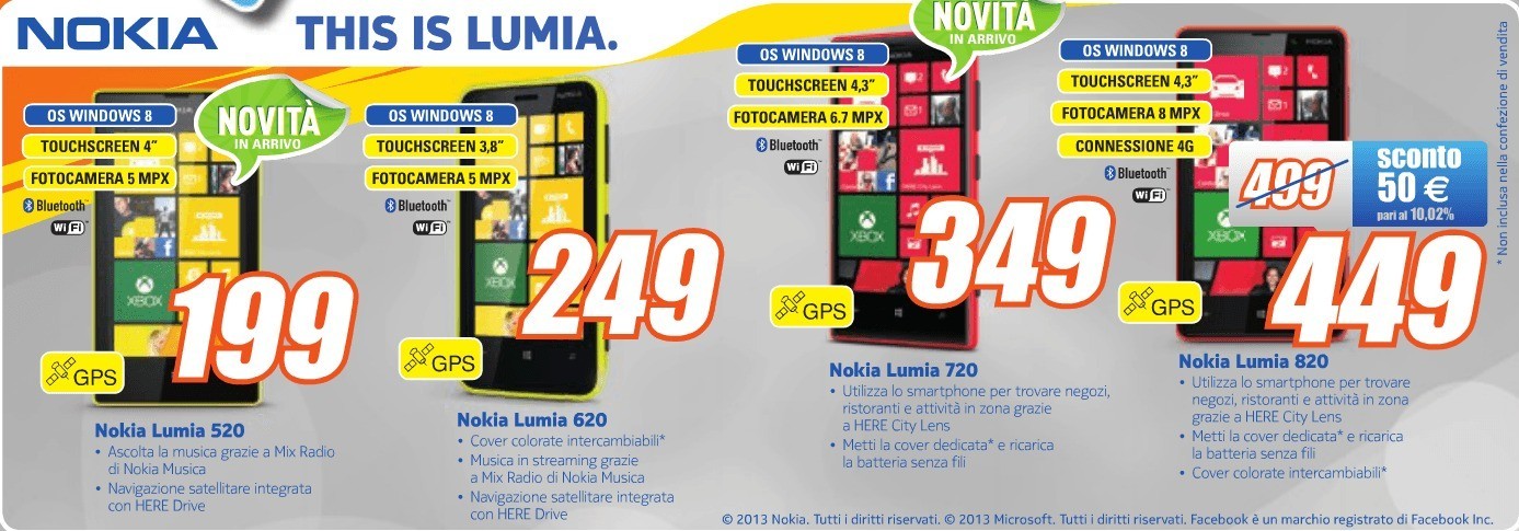 Dopo essere stati presentati al MWC 2013 di Barcellona, sbarcano finalmente in Italia gli altri 2 modelli della fascia Lumia ovvero il 520 e il 720, che si vanno ad aggiungere ai loro fratelli maggiori Lumia 620 e 920. Gli ultimi due arrivati vengono venduti in offerta dalla catena Expert rispettivamente a € 199 e € 349.