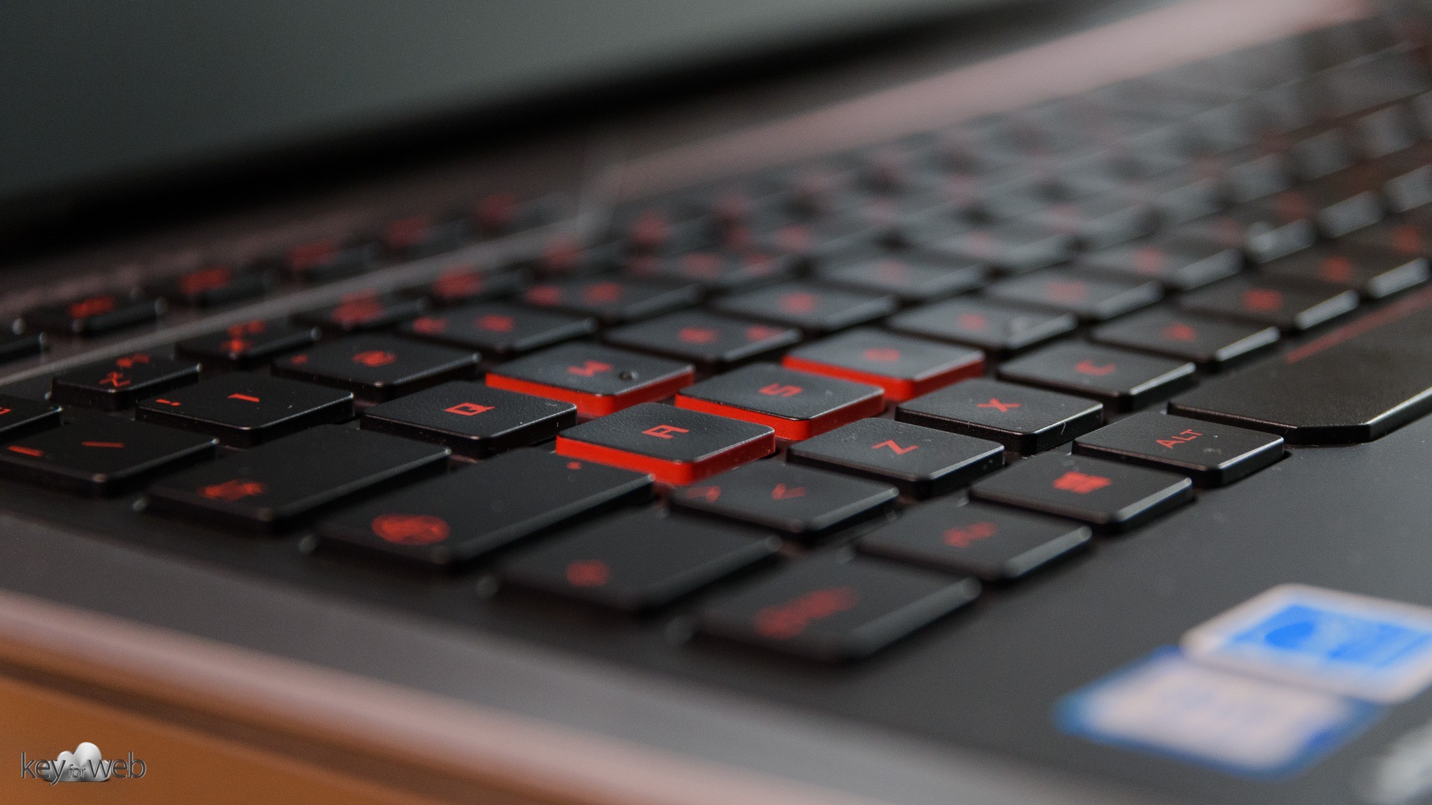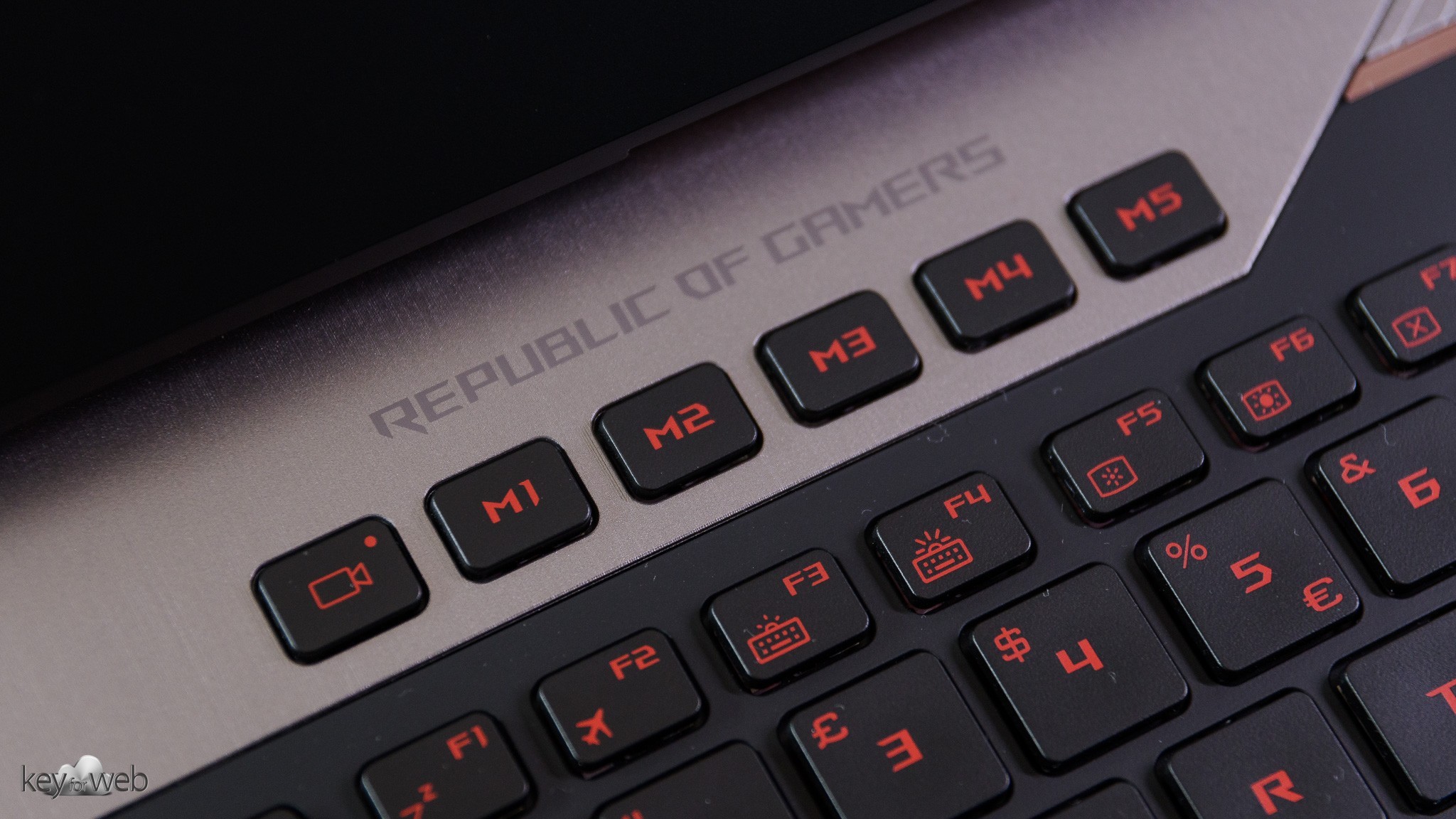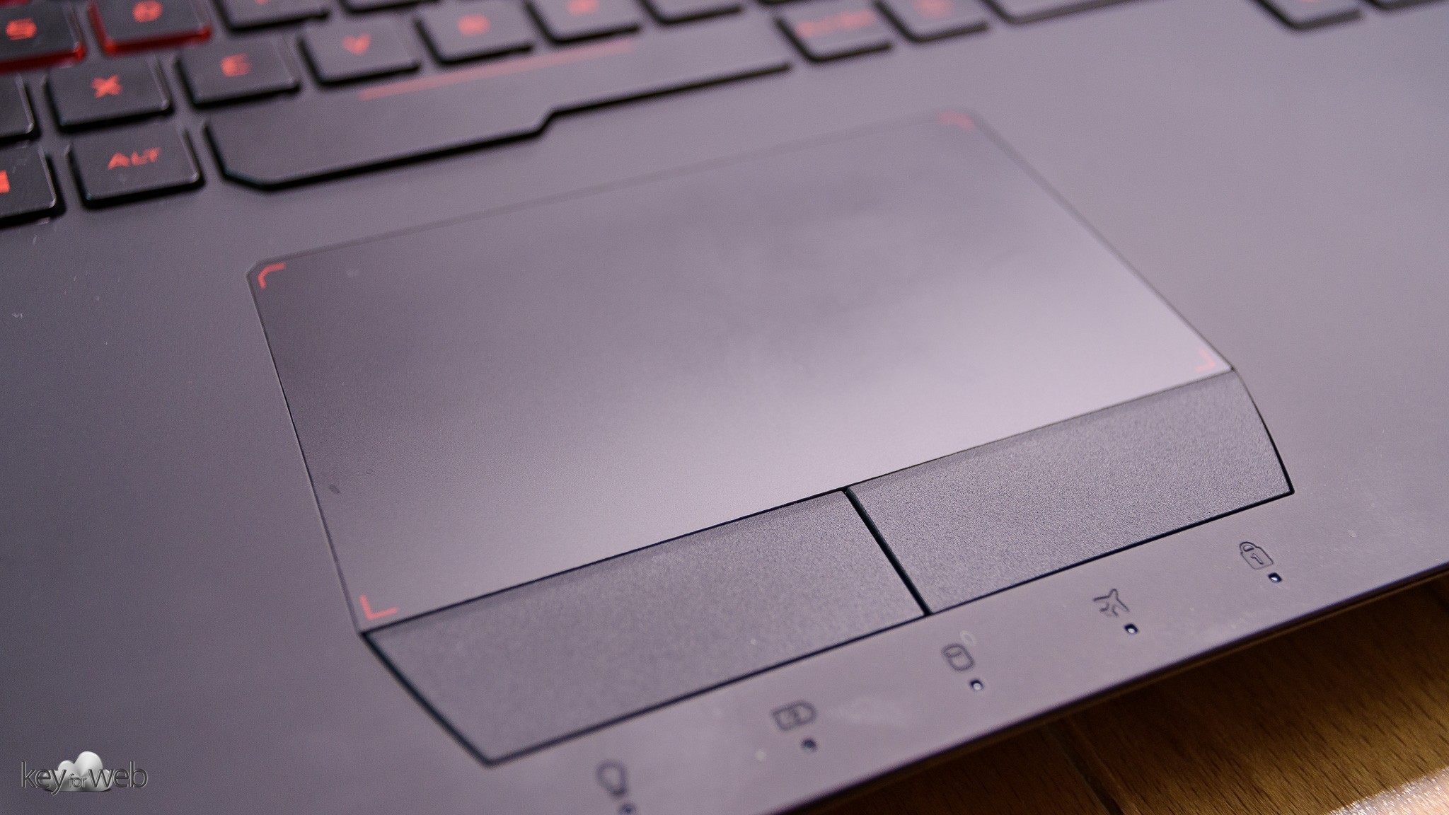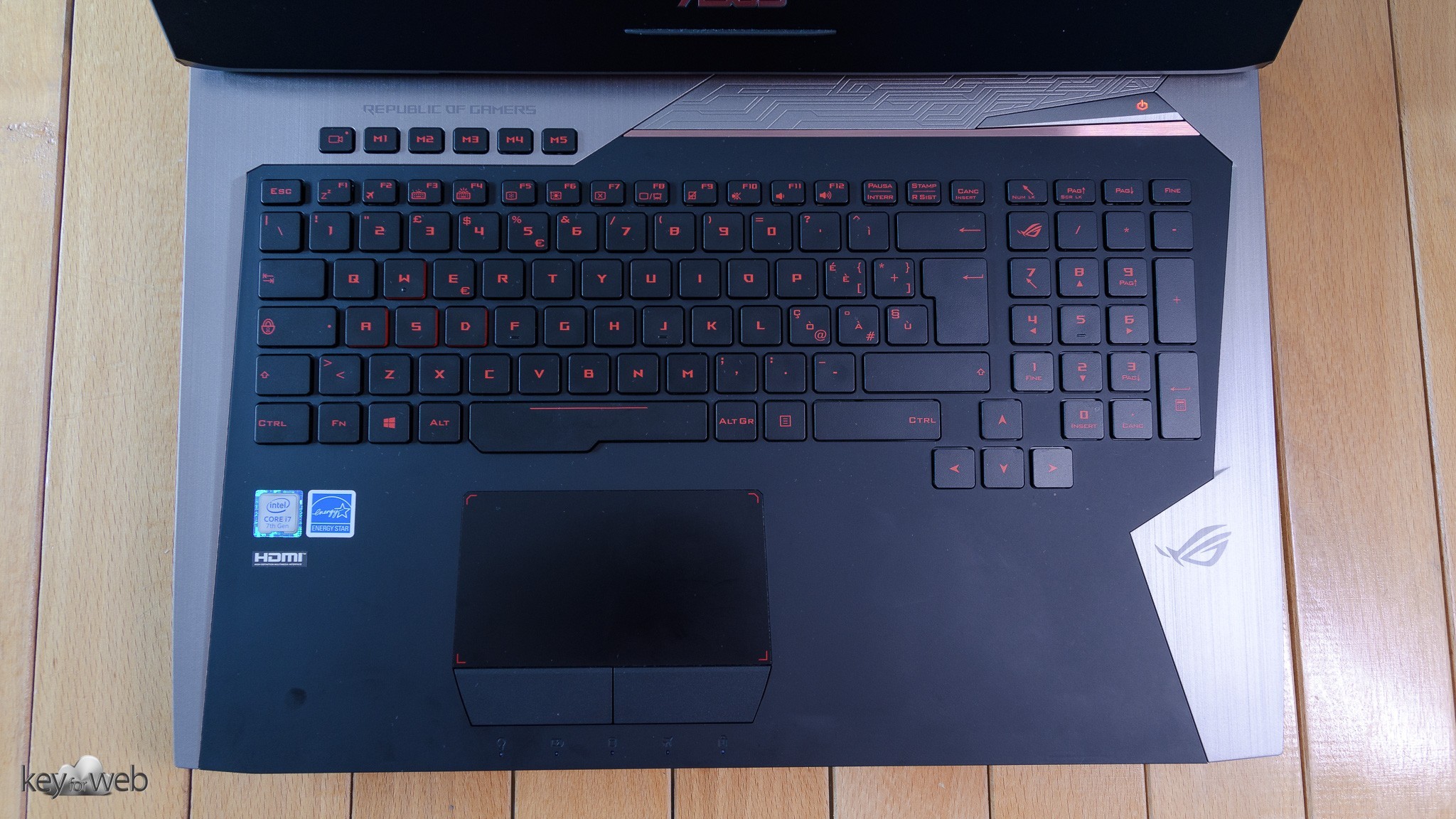 Nella parte interna vi sono il pulsante di alimentazione, retroilluminato di rosso, 5 tasti Macro-Key e la tastiera che possiede una corsa di 2.5mm, anch’essa retroilluminata. Il Touch-Pad è molto ampio, preciso e con i tasti destro e sinistro molto silenziosi e morbidi alla pressione. Purtroppo l’illuminazione della tastiera, causa software o hardware, non è mai stata visibile nonostante il ripristino sia del computer che dei driver.