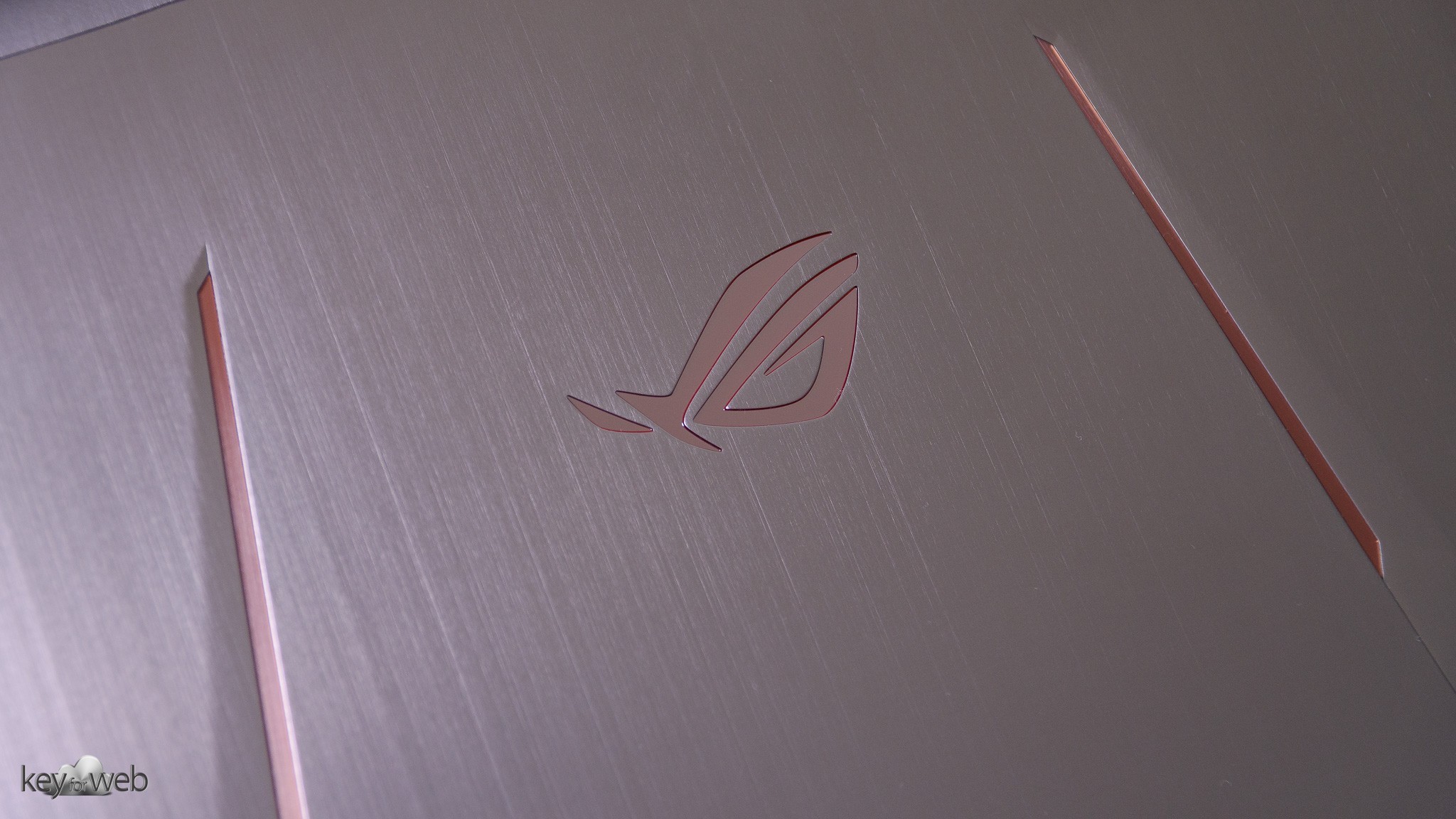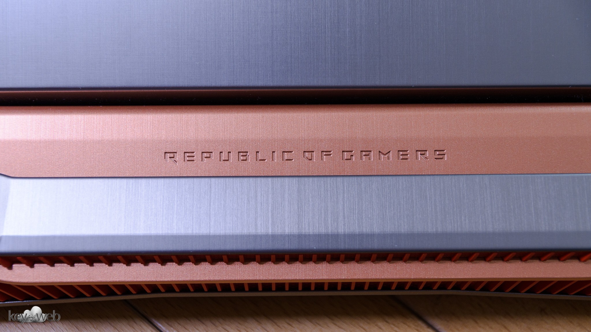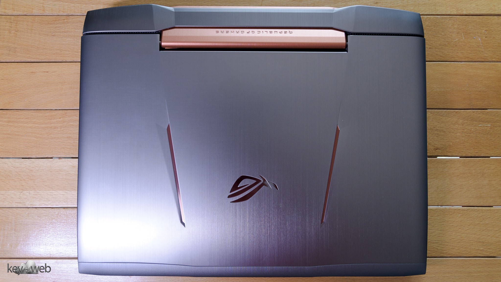 Il marchio ROG presente sulla parte posteriore è retroilluminato di rosso e presenta due insenature color rame ai lati che confluiscono verso la cerniera del monitor, anch’essa di color rame, con incisa al suo interno la scritta “REPUBLIC OF GAMERS”. Proprio la cerniera offre grande solidità e buona resistenza tale che il monitor resti fermo anche se scuotiamo il computer; è possibile aprirlo fino ad un massimo di 145°.