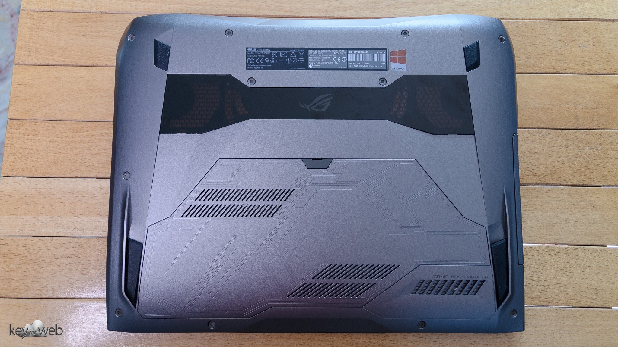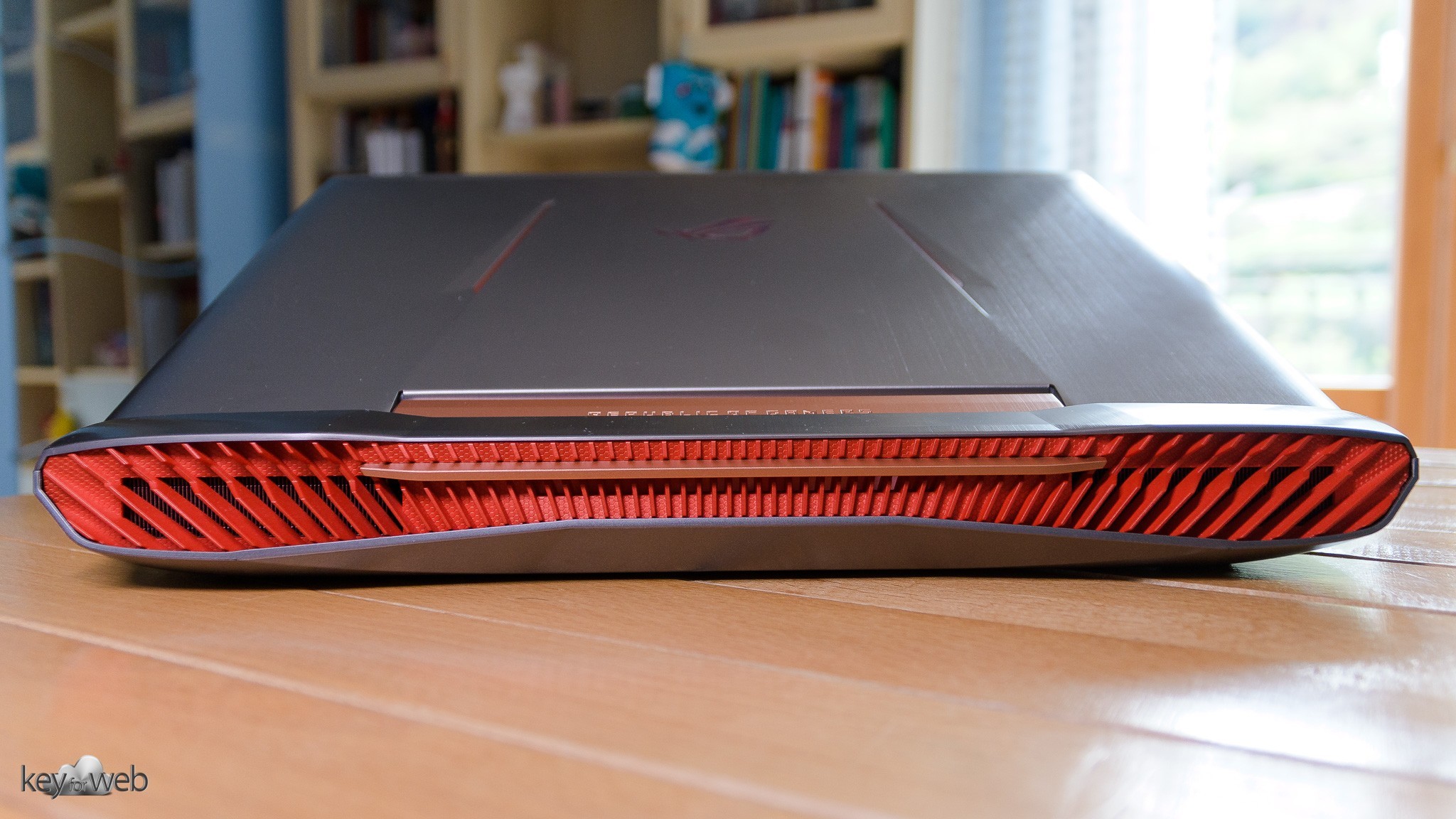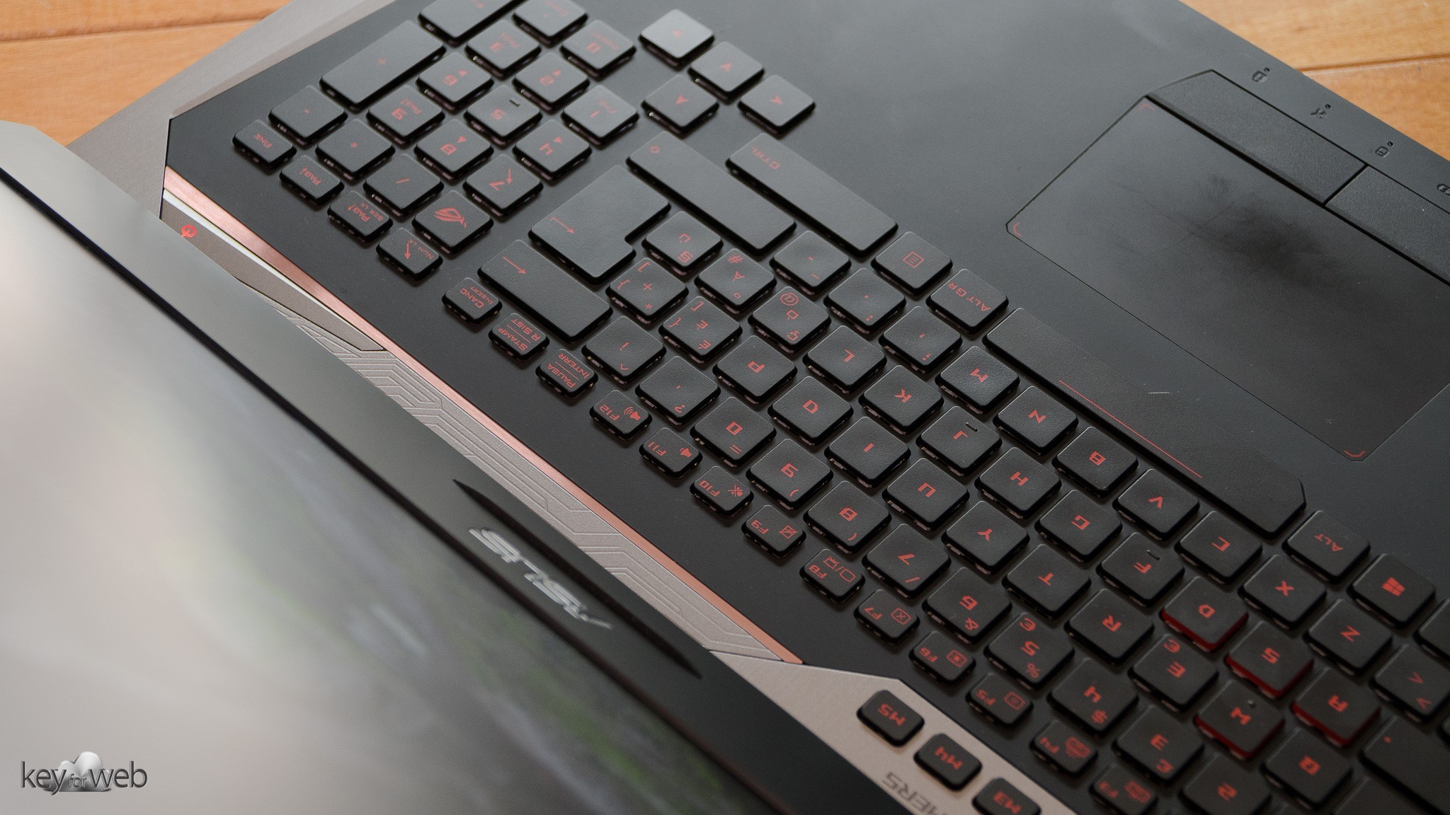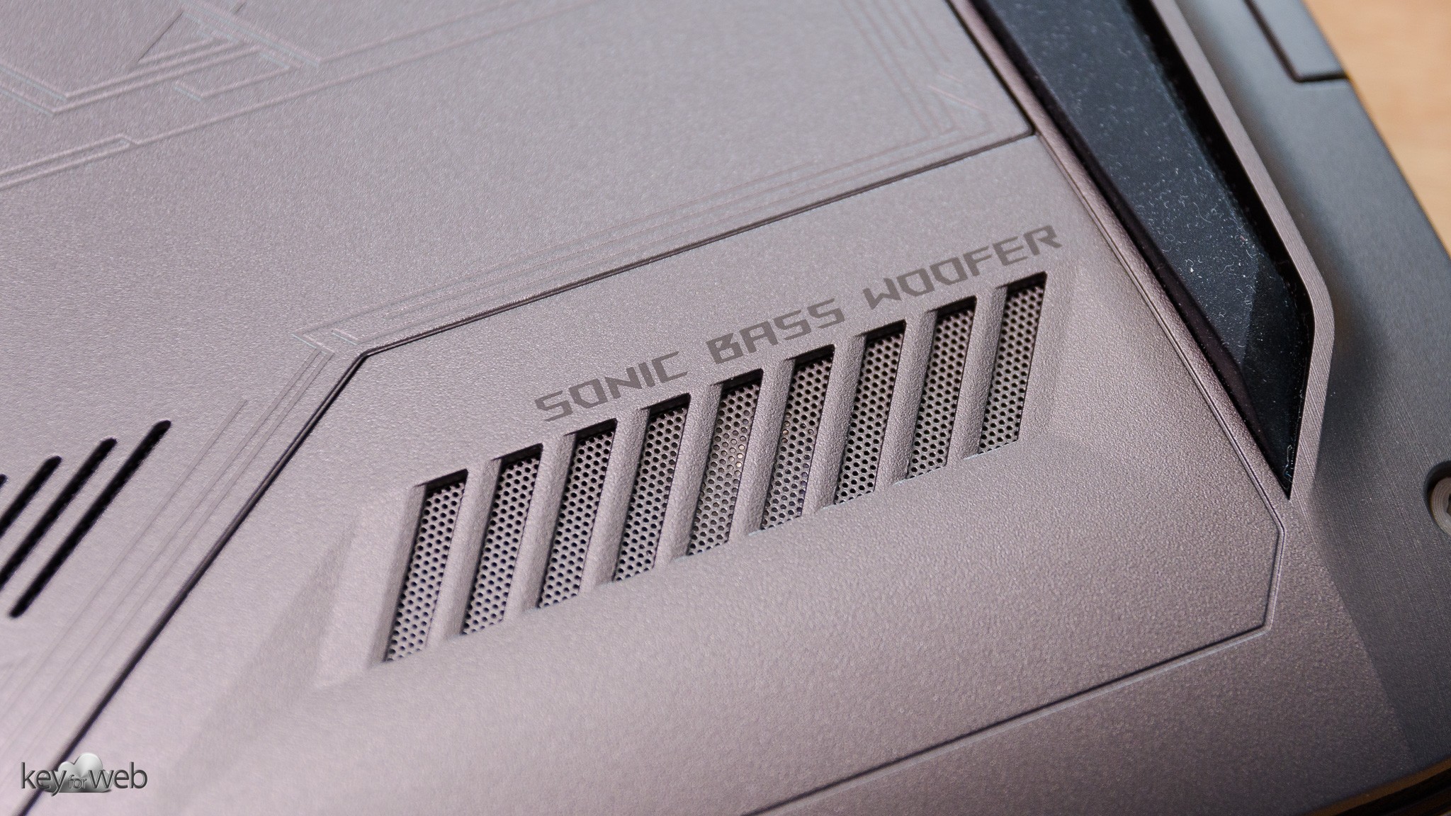 Il marchio ROG presente sulla parte posteriore è retroilluminato di rosso e presenta due insenature color rame ai lati che confluiscono verso la cerniera del monitor, anch’essa di color rame, con incisa al suo interno la scritta “REPUBLIC OF GAMERS”. Proprio la cerniera offre grande solidità e buona resistenza tale che il monitor resti fermo anche se scuotiamo il computer; è possibile aprirlo fino ad un massimo di 145°.