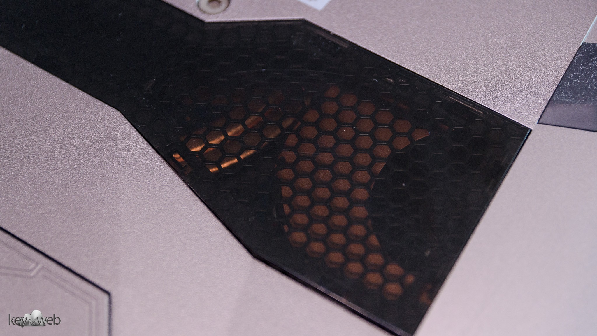 Sulla parte posteriore troviamo due enormi griglie per l’espulsione dell’aria calda tramite il nuovo sistema di dissipazione a doppia ventola con tecnologia 3D Vapor Chamber che sfrutta la camera di vapore per una migliore dissipazione. Il sistema di raffreddamento lo si intravede dalla parte posteriore del Computer dove è presente una finestra in PlexiGlass scuro.