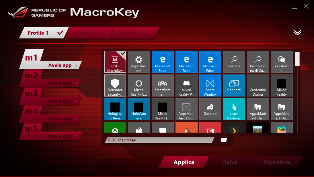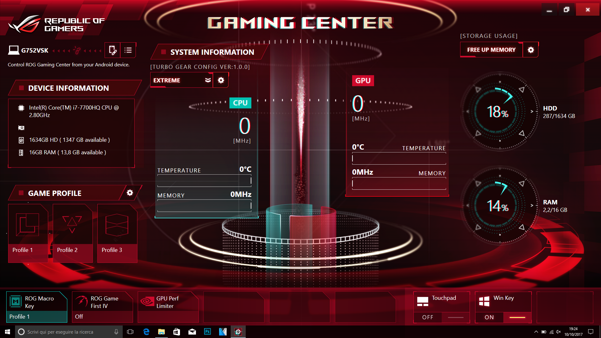 Windows 10 così come tutti lo conosciamo con l’aggiunta di qualche Software proprietario dedicato all’utilizzo Gaming. Troviamo il ROG Gaming Center, il ROG Macro-Key e GameFirst 4. Altri Software possono essere scaricati presso il sito ufficiale del produttore.