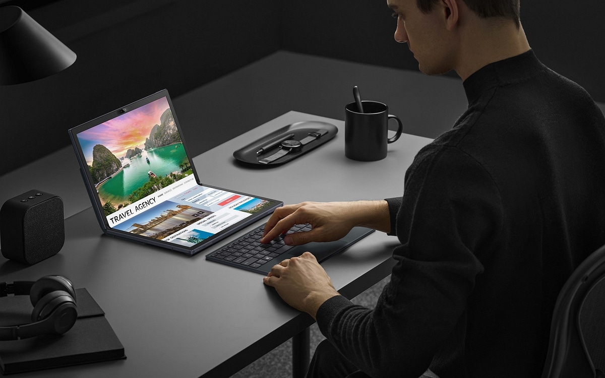 Nonostante il suo formato particolare, l’Asus Zenbook 17 Fold OLED ci offre una scheda tecnica piuttosto interessante. Il suo touch screen 4:3 17,3 pollici 2,5K OLED 60 Hz con una definizione di 2560 x 1920 pixel può essere piegato in due parti uguali di 12,5 pollici . Il suo aspetto pieghevole non lo rende comunque un pessimo schermo, dal momento che troviamo una luminosità massima di 500 nits , supporto al 100% per DCI-P3 , HDR e Dolby Vision o un tempo di risposta di 0,2 ms. Secondo Asus, lo schermo supporterebbe “solo” 30.000 aperture e chiusure , ben lontane dalle 200.000 pieghe fornite dal Galaxy Z Fold 4. Tuttavia, questo dovrebbe consentire di usarlo in media 6 volte al giorno per 9 anni.