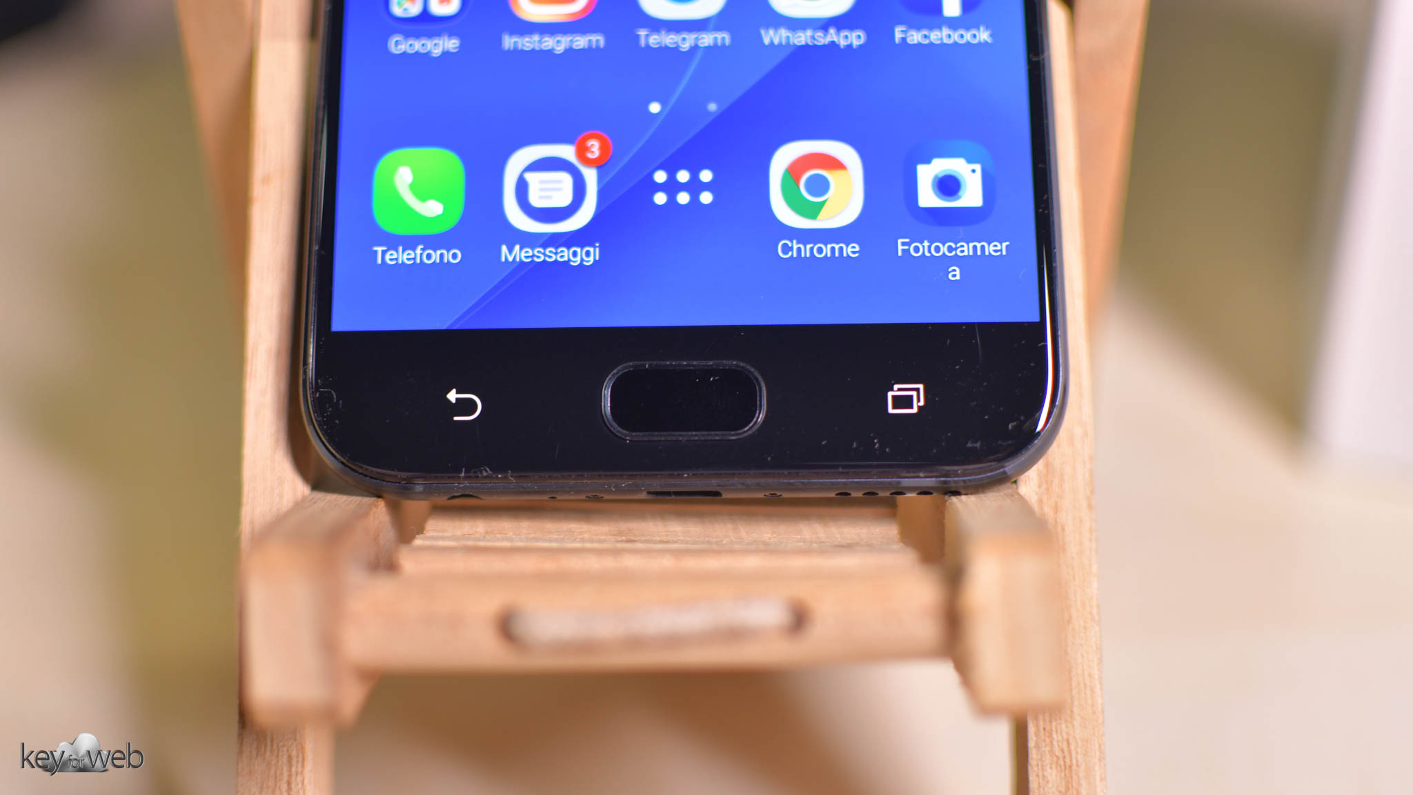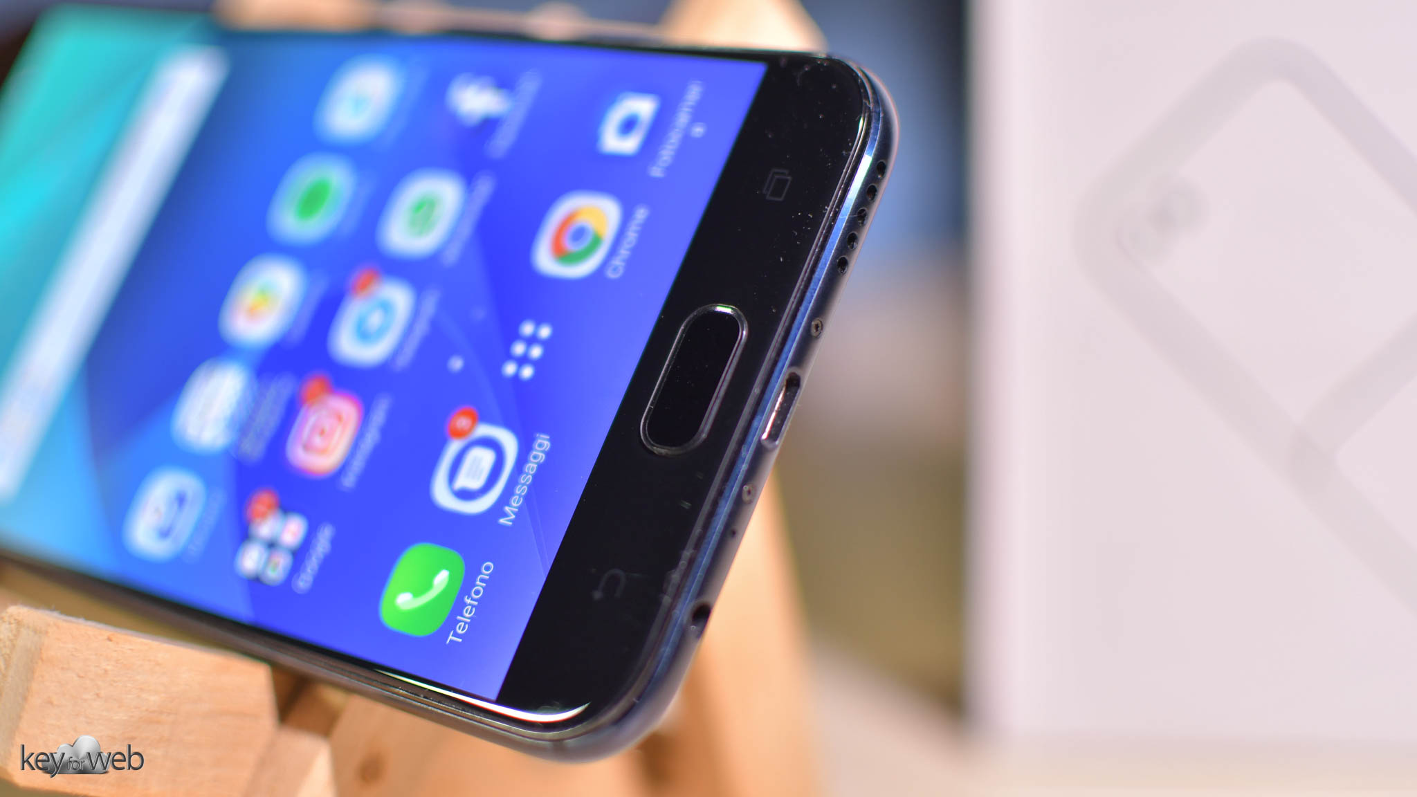 Anteriormente troviamo in basso il sensore per il riconoscimento delle impronte, molto rapido, centrato tra i tasti back e multi-tasking, retroilluminati. In alto vi è il LED di notifica, due fotocamere frontali, la capsula audio interna, i sensori di luminosità e prossimità e per finire un flash-LED.