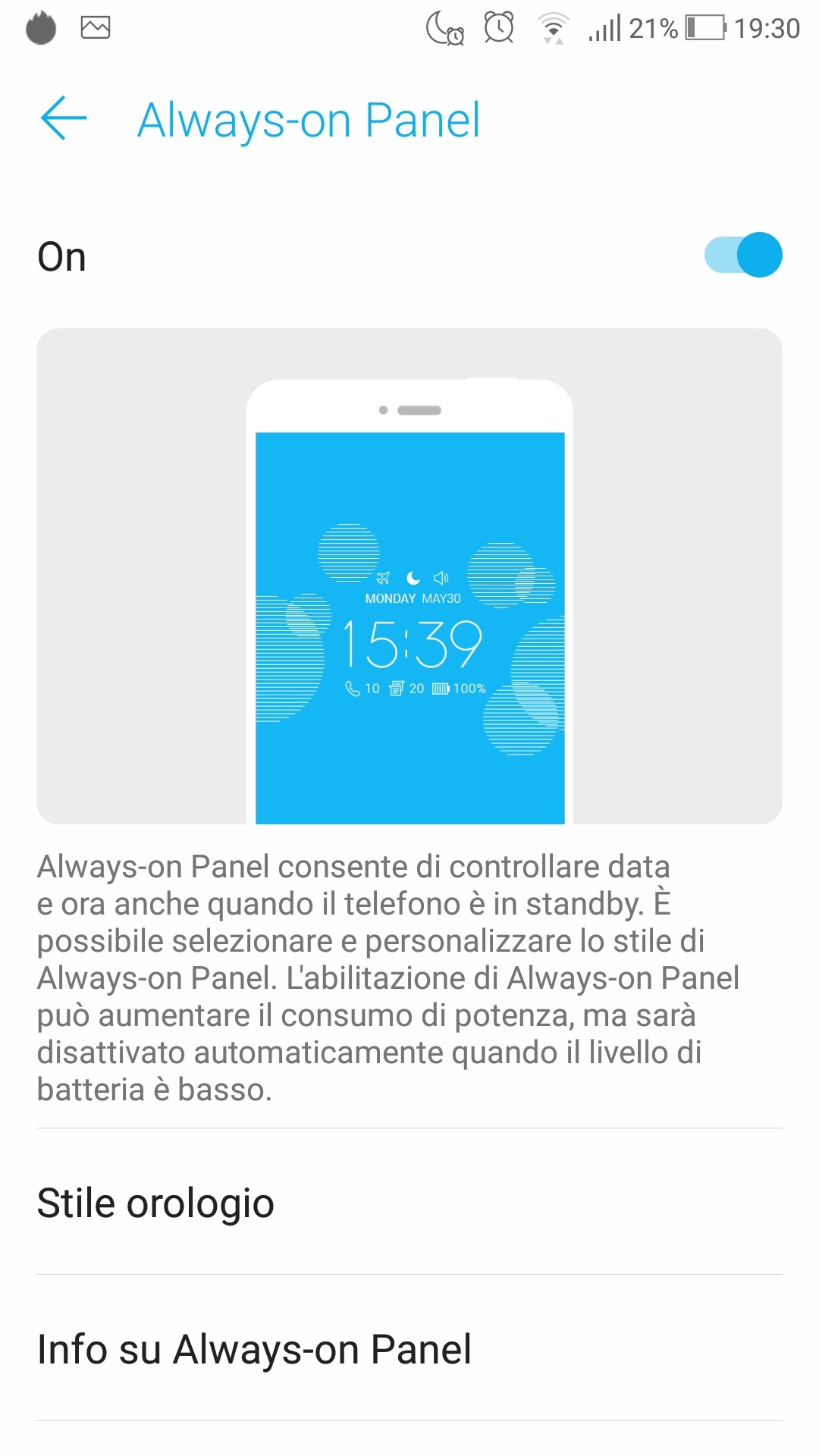 La modalità always-on permette di visualizzare permanentemente le informazioni più utili sul display come data, ora, percentuale batteria e notifiche. L’aspetto è completamente personalizzabile all’interno delle imposta1zioni.