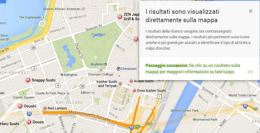 …i risultati della nostra ricerca saranno verranno direttamente sulla mappa con delle icone rappresentative della categoria (ristorante, shop, ecc.) e di rilevanza (la grandezza dell’icona cambia probabilmente in base alle recensioni positive ricevute).