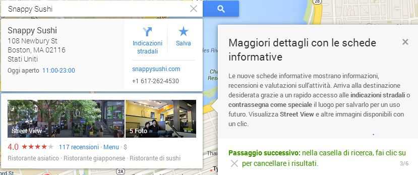 Una volta individuato il luogo di interesse sarà sufficiente un click per far apparire una finestrella che mostra subito tutti i dati più rilevanti ovvero nome, indirizzo, numero di telefono, orari di apertura, recensioni e una scorciatoia per le indicazioni stradali.