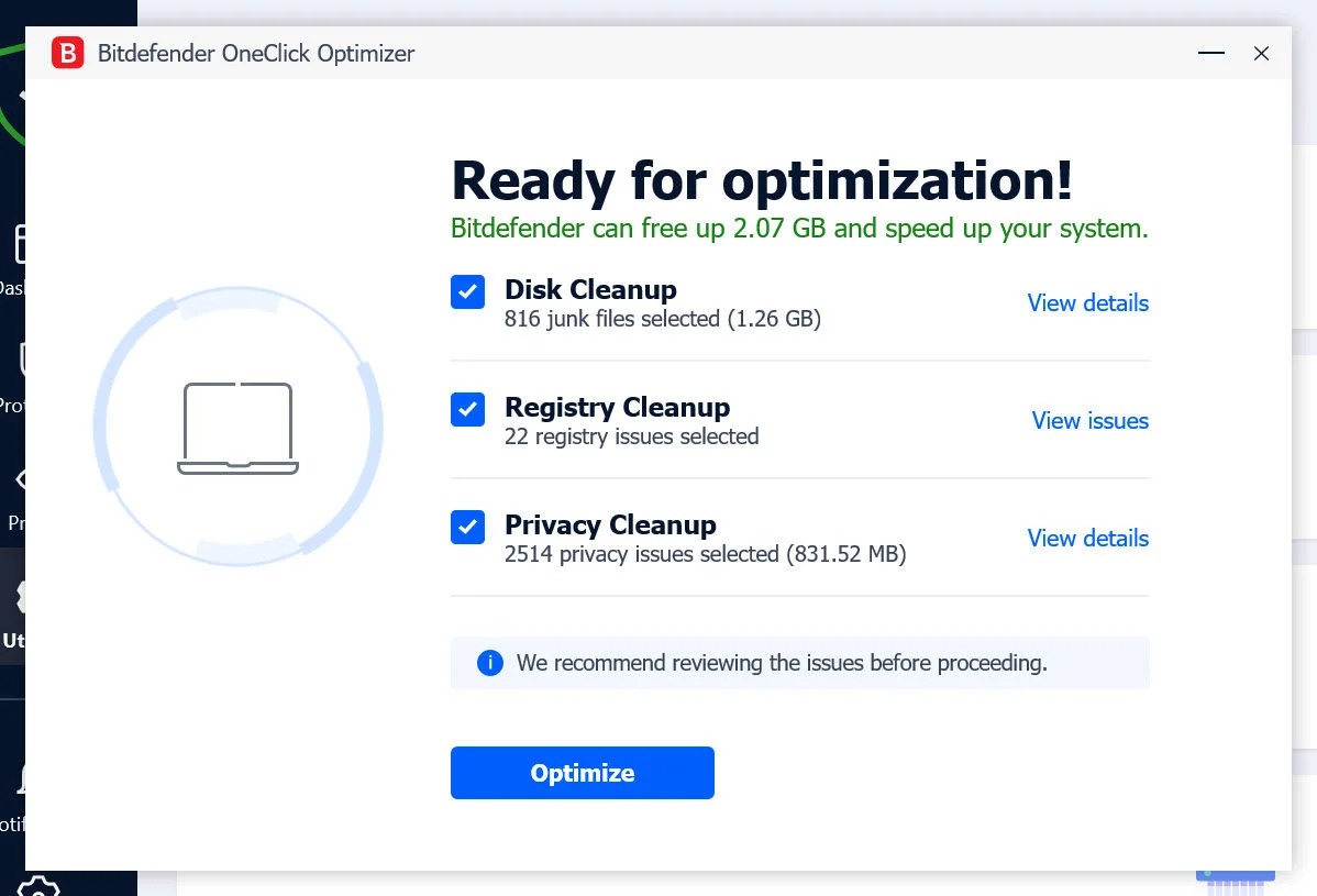 Una delle caratteristiche esclusive di Total Security è sicuramente Oneclick Optimizer. Questo cerca lo spazio su disco che può essere liberato, elementi delle voci di registro che possono essere eliminate (per migliorare le prestazioni di Windows) e fa, in generale, una Pulizia di tutti i dati sensibili immessi nel web eliminando non solo la cronologia di navigazione ma anche i file temporanei (cache) ed i cookie.