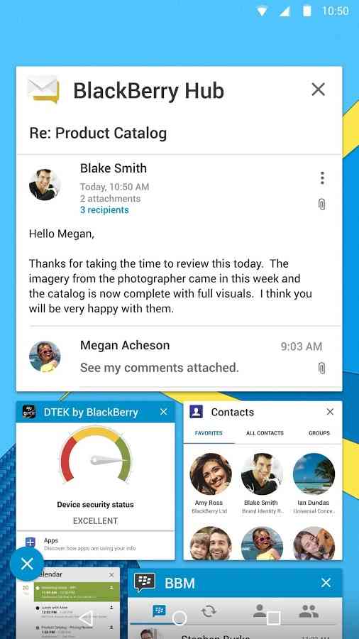BlackBerry Hub + è una suite composta da otto applicazioni. All’inizio del mese scorso, BlackBerry ha fatto messo a disposizione degli utenti Android la suite per i dispositivi alimentati da Marshmallow (Android 6.0). Ora, invece, l’insieme di applicazioni è disponibile per i dispositivi Android a partire dalla versione 5.0 Lollipop. All’interno della suite troverete BlackBerry Hub, applicazione per la posta dove inserire tutti i propri account, Password Keeper, per tenere al sicuro le password, BlackBerry Calendar consente di effettuare chiamate in conferenza direttamente dal promemoria del calendario e Contatti che consente di memorizzare i numeri in una posizione specifica. Con le attività è possibile seguire e tenere traccia dello stato di avanzamento delle diverse attività, impostando le date di scadenza e promemoria.