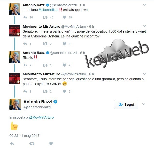 Ad ogni modo, il premio per il tweet più esilarante va al Senatore Antonio Razzi, magistralmente “trollato” da @MovMirtArturo (Movimento MirtArturo): “Intrusione #cibernetica ‼️#whatsappdown”, scrive Razzi. “Senatore, in rete si parla di un’intrusione del dispositivo T800 dal sistema Skynet della Cyberdine System. Lei ha qualche riscontro?”, risponde @MovMirtArturo. Il Senatore controrisponde con un “Risolto” e @MovMirtArturo