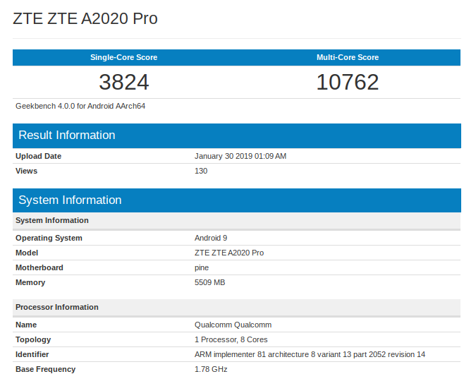 Per quanto riguarda l’altro dispositivo, ovvero l’Axon 10 Pro, troviamo i primi test benchmark sul portale Geekbench, i quali rivelano un punteggio di 3.824 nella modalità single core e 10.762 in quella multi core.