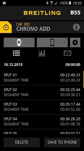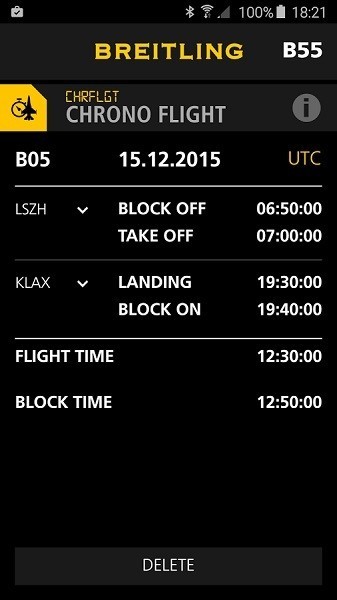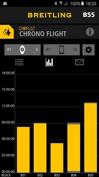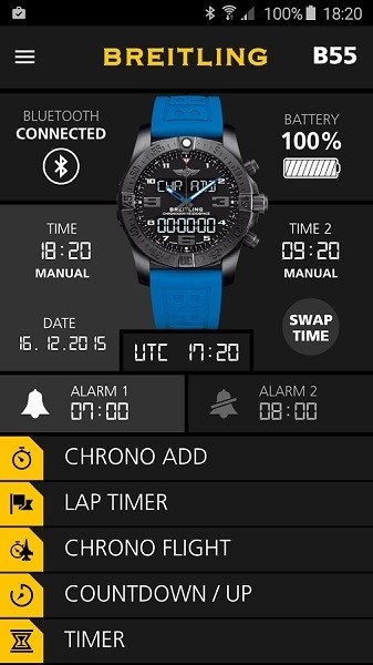 L’abbinamento con lo smartphone avviene mediante una connessione Bluetooth 4.0 LE. Il Breitling Exospace B55 funziona però in modo totalmente indipendente dallo smartphone. Quest’ultimo serve solo per eseguire alcune operazioni in maniera più semplice, mediante le app per iOS e Android, come l’impostazione di ora, fusi orari, allarmi, parametri di indicazione e di funzionamento, modalità notte, ecc. L’utente può anche scaricare dal cronografo allo smartphone i risultati di varie misure (tempi di volo, tempi cronometrati con tempi intermedi, tempi per giro, ecc.) per leggerli più agevolmente, salvarli o trasmetterli.