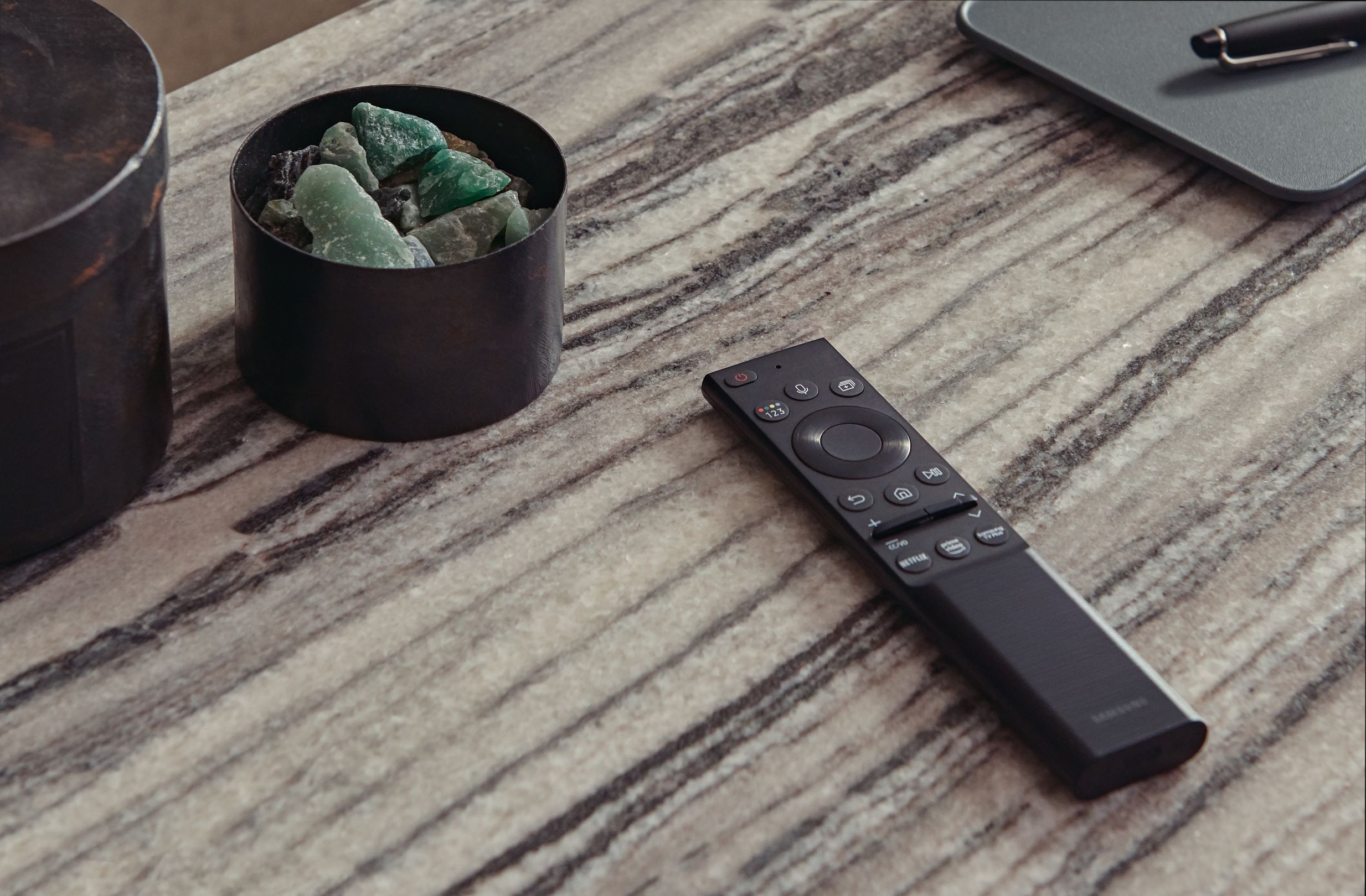 - Telecomando a cella solare: nel 2021 i TV Samsung saranno dotati di un telecomando a energia solare che può essere ricaricato dalla luce del sole ma anche dalle luci di casa, o tramite USB: una novità assoluta per Samsung. Questo contribuirà a eliminare lo scarto di 99 milioni di batterie AAA in sette anni[2]. Per costruire questo telecomando, Samsung ha innovato inoltre il processo di produzione, impiegando il 24% di materiale riciclato da bottiglie di plastica.