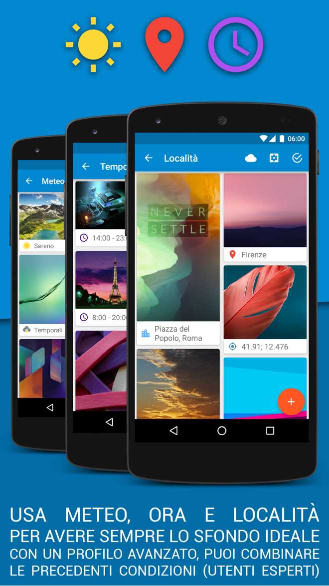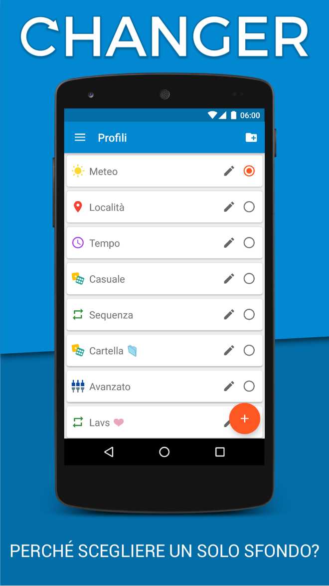 L’app, sviluppata dal giovanissimo Simone Sessa (www.simonesessa.it), nasce da un semplice presupposto, cambiare sfondo automaticamente senza incidere sulle prestazioni della batteria del dispositivo. A seconda delle esigenze dell’utente, l’applicazione permette di creare vari profili impostando le condizioni e la frequenza degli sfondi: