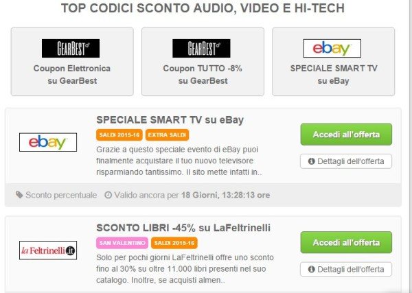 Oggi andremo a scoprire insieme, un sito di vantaggiose offerte e di sconti online: Codicesconto.com, il primo portale italiano di coupon e voucher con vantaggiosissimi sconti sul mondo della tecnologia: dalle nuovissime Smart Tv agli Smartphone, dagli ebook fino ai Notebook e non solo. Con la collaborazione dei maggiori e più famosi brand mondiali, su Codicesconto.com, si possono trovare giornalmente nuove offerte e codici sconto imperdibili. Andiamo a scoprire insieme tutti i dettagli.