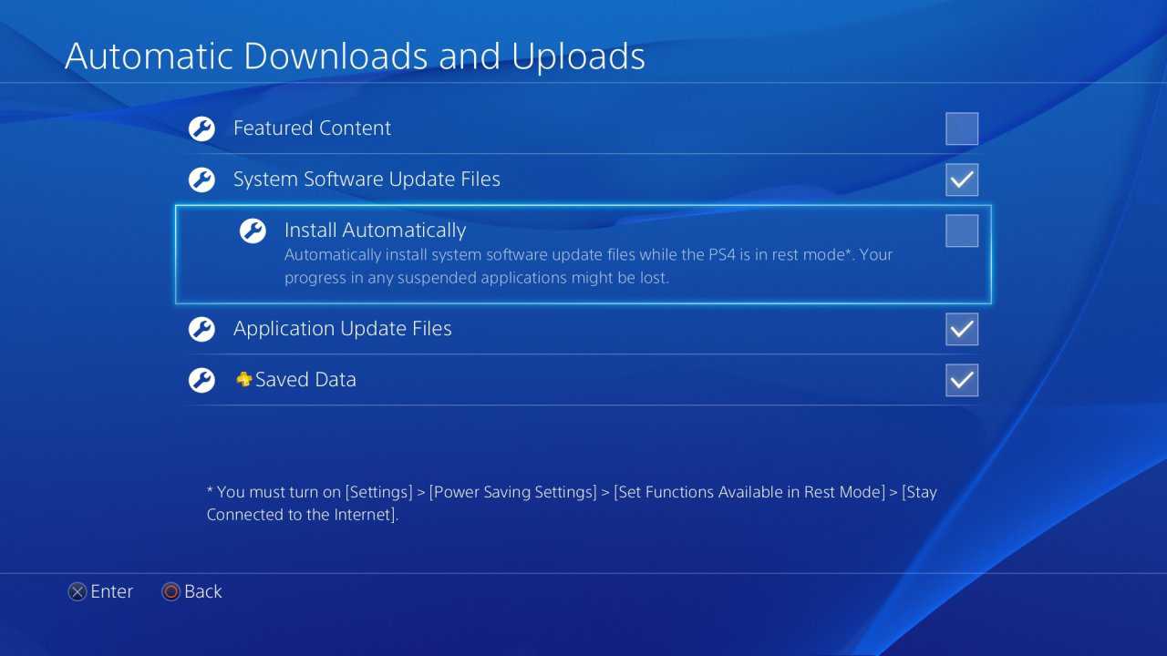 Sarete di fronte ad un elenco di azioni che verranno eseguita mentre la console è in modalità di riposo. Assicurarsi che ‘File di Aggiornamento software del sistema’ sia selezionata, e scorrere fino ad ‘Installa automaticamente’. Selezionare questa casella.