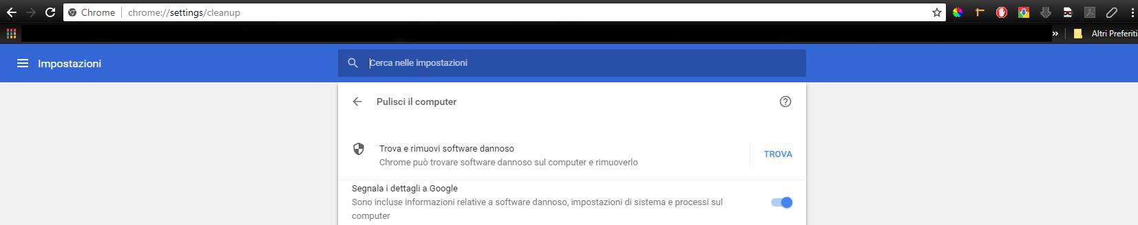 L’alternativa è scrivere direttamente nella barra degli indirizzi (dove digitate gli indirizzi relativi ai siti web che volete consultare) il comando “chrome://settings/cleanup”. Una volta aperta la schermata cliccare su “Trova” e lo scanner inizierà la scansione sulla cartella Chrome.