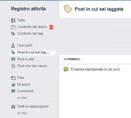 Visualizzate il vostro registro attività tramite il tasto situato all’angolo inferiore destro dell’immagine di copertina, e da lì selezionate, nella lista che troverete sulla sinistra della pagina, l’opzione “Post in cui sei taggato“.
