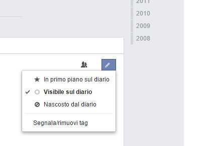 Otterrete così, in ordine cronologico dal più recente al più datato, tutti i post in cui siete stati taggati: post dei quali potrete modificare le impostazioni di visualizzazione semplicemente cliccando sul simbolo della matita a fianco a ciascuno di essi. Sicuramente noterete una spunta in corrispondenza della voce “Visibile sul diario“; la spunta vi informa che senza alcuna azione da parte vostra la scelta predefinita prevede che il tag appaia tranquillamente sulla vostra bacheca. Scegliendo l’opzione “Nascosto dal diario” avrete invece la possibilità di evitare che il tag sia in alcun modo su di essa visibile.